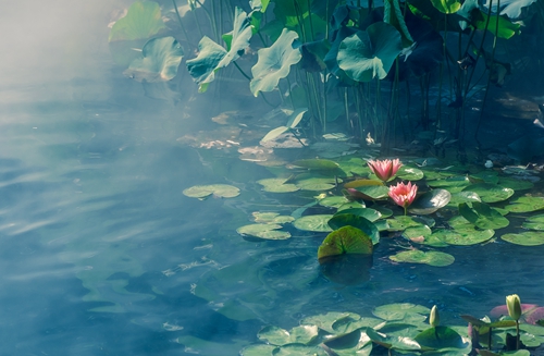 〔幺篇〕丹青墨染千重浪,画桥西、翠盖鸳鸯。蛙鼓鸣,婵欢唱,双飞白鹭,十里好风光。